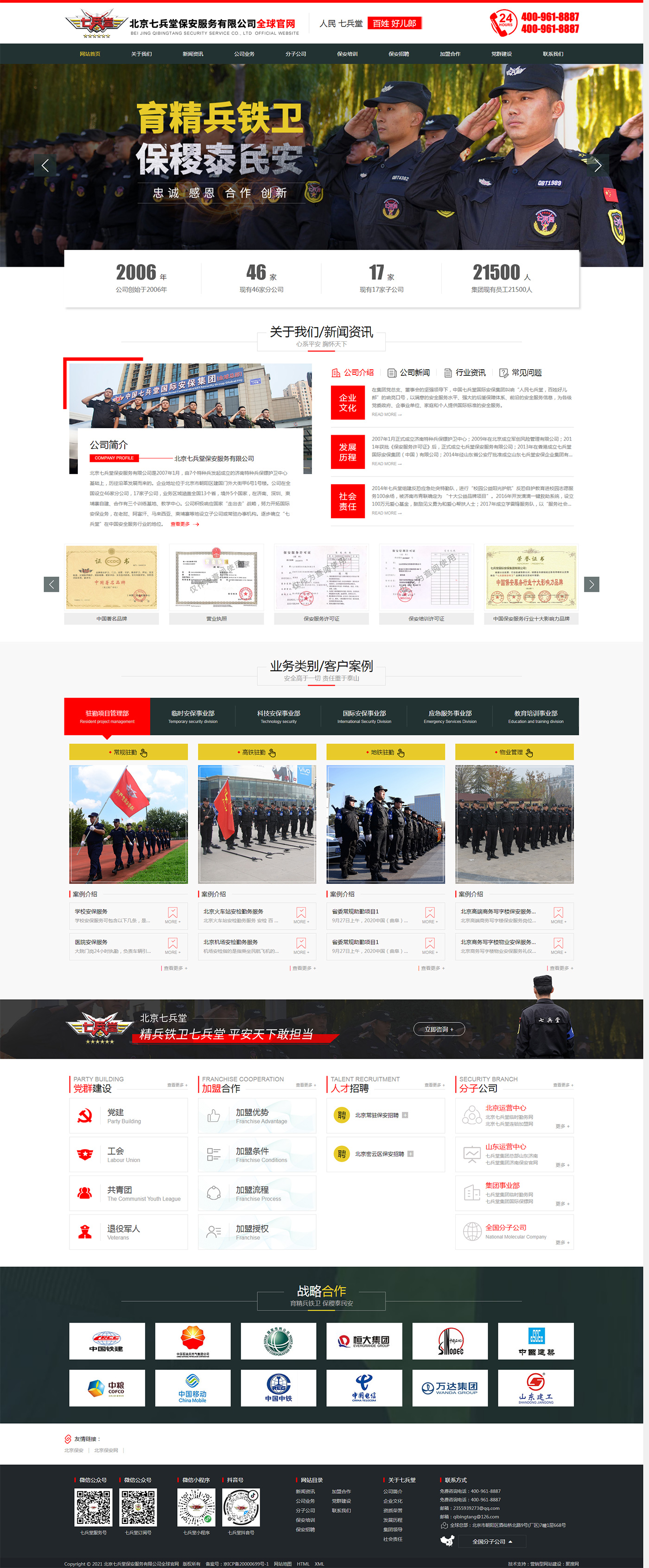 北京七兵堂保安服務有限公司是2007年1月,由7個特種兵發起成立的濟南特種兵保鏢護衛中心基礎上,歷經沿革發展而來的。企業地址位于北京市朝陽區建國門外大街甲6號1號樓。公司在全國設立46家分公司,17家子公司,業務區域涵蓋全國13個省,境外5個國家,在濟南、深圳、柬埔寨自建、合作有三個訓練基地、教學中心。公司積極響應國家“走出去”戰略,努力開拓國際安保業務,在老撾、阿富汗、馬來西亞、柬埔寨等地設立子公司或常駐辦事機構。逐步確立“七兵堂”在中國安全服務行業的地位。