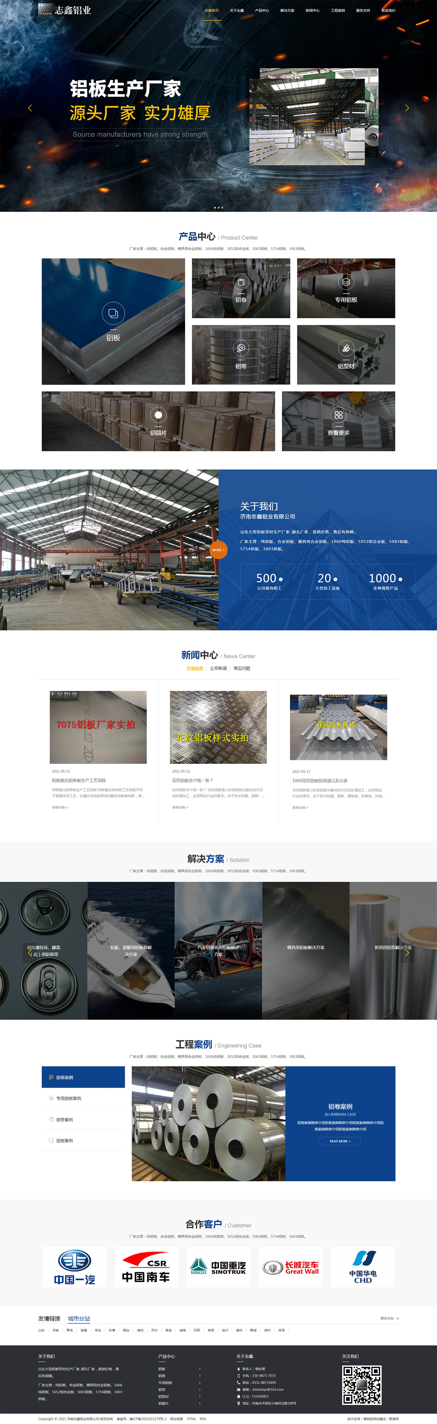 濟南志鑫鋁業有限公司是一家集科研、加工、制造為一體的大型現代化鋁加工企業,主要從事鋁板、鋁卷、鋁型材的生產和銷售。公司坐落于風景秀麗的泉城濟南,占地面積5萬平方米,現有職工500余人,擁有半連續鑄造生產線3條、連鑄連軋生產線5條、其他大型加工設備20多臺,年產量達到10萬噸。